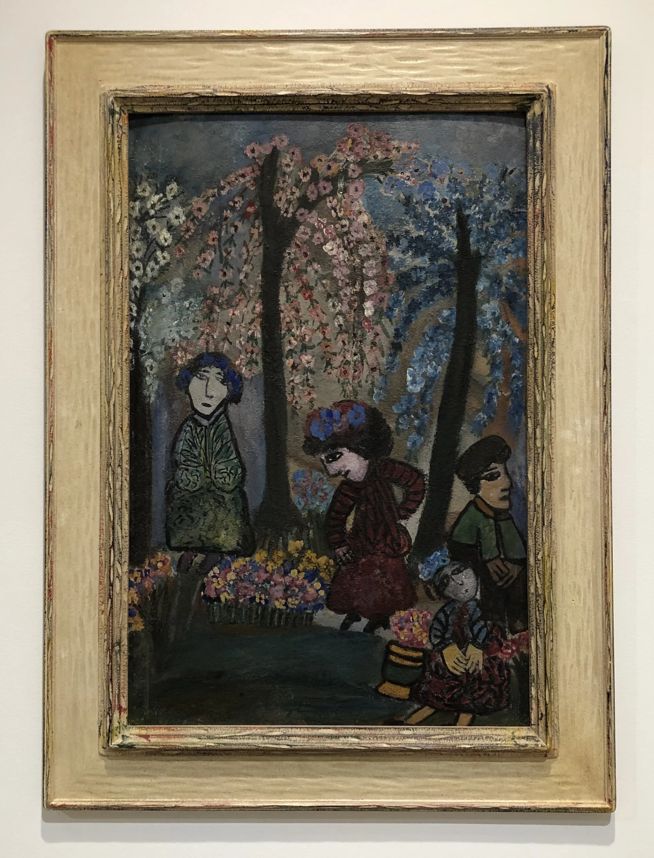 The painter’s early style, many examples of which are on view in the front gallery, is also naïve, and deeply embedded in the folk imagery of Eastern Europe. (I couldn’t shake seeing the striking resemblance to fellow Eastern European expat Marc Chagall’s lyrical style.)